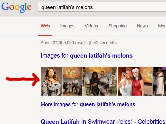 Turns out that I'm number 1 for "Queen Latifah's melons" on google image search. Yippee! Click on the photo of Queen Latifah in the top left-hand corner and you end up at my blog.
